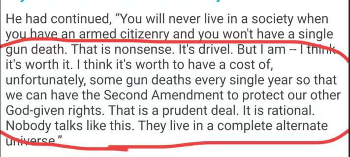 在柯克遇刺身亡后,有人从他的社交账号上翻出了他捍卫美国人持枪自由,并以此为美国的枪支暴力问题辩解的种种发言。在其中一则发言中,他表示,如果要想捍卫美国人持枪的宪法权利,就得接受美国必定会有“一些”枪支暴力案件发生的现实。