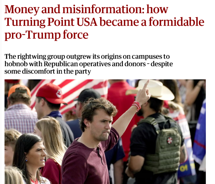 英国《卫报》2021年的一篇报道披露称,柯克在2012年刚“出道”时成立的“美利坚拐点”组织,2016年到2020年间的收入几乎增长了10倍,从430万美元一跃达到3980万美元。该报还称,在2020年美国大选、疫苗等一系列议题上,柯克一直发挥着为特朗普阵营扩散特定叙事的作用。