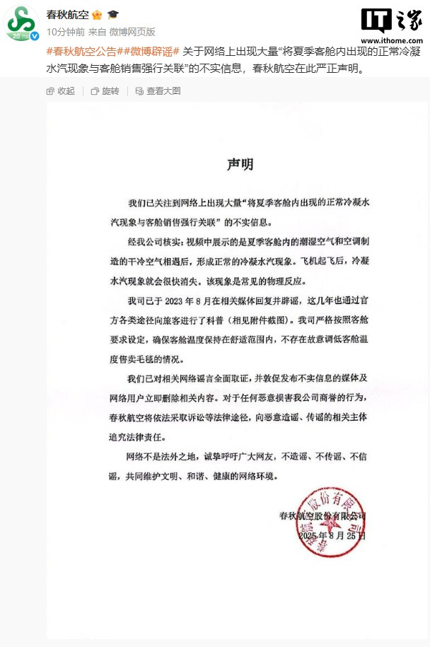 公司已对相关网络谣言全面取证,并敦促发布不实信息的媒体及网络用户立即删除相关内容。对于任何恶意损害我公司商誉的行为,春秋航空将依法采取诉讼等法律途径,向恶意造谣、传谣的相关主体追究法律责任。